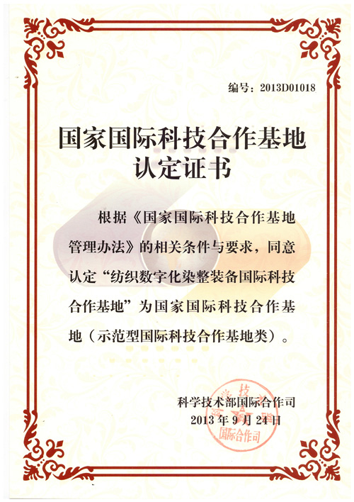11月30日,2013年度國家國際科技合作基地證書授予儀式暨國合基地工作座談會(huì)在山西太原舉行�?萍疾坎芙×指辈块L出席了國合基地證書授予儀式,并就國際科技合作發(fā)表重要講話�?萍疾繃H合作司司長靳曉明等領(lǐng)導(dǎo)出席會(huì)議。山東康平納集團(tuán)公司被授予“紡織數(shù)字染整裝備國際科技合作基地”。集團(tuán)董事長陳隊(duì)范(上圖左二)參加會(huì)議并領(lǐng)取基地證書。