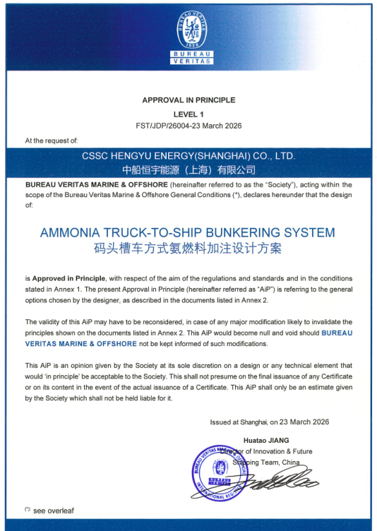近日,中船物資恒宇能源公司氨燃料碼頭槽車式氨燃料加注設(shè)計方案獲AIP認(rèn)證。項(xiàng)目研發(fā)團(tuán)隊(duì)明確低溫液氨為加注介質(zhì),錨定核心研發(fā)方向,開展全面市場調(diào)研與行業(yè)摸排,持續(xù)深耕技術(shù)路徑探索,反復(fù)進(jìn)行方案論證迭代,成功攻克多項(xiàng)技術(shù)瓶頸,最終形成安全可靠、高效便捷、可落地實(shí)施的技術(shù)方案,順利通過嚴(yán)苛評審。