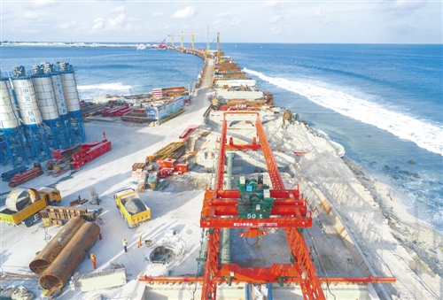 這是7月6日在馬爾代夫航拍的建設(shè)中的中馬友誼大橋。隨著主橋23號墩承臺最后一車混凝土的澆筑,中國援馬爾代夫中馬友誼大橋5個(gè)主橋承臺6日全部施工完成,標(biāo)志著占全橋施工總量約70%的主橋部分從此徹底擺脫印度洋的強(qiáng)涌浪襲擾,進(jìn)入上部結(jié)構(gòu)施工階段。