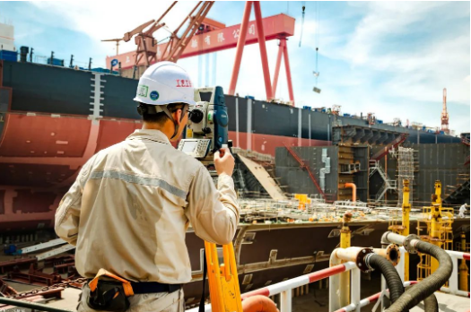 近40度的高溫天氣下,一位造船精度人堅守崗位,使用全站儀監(jiān)控船塢每個搭載總段的定位精度,保障一次搭載到位。