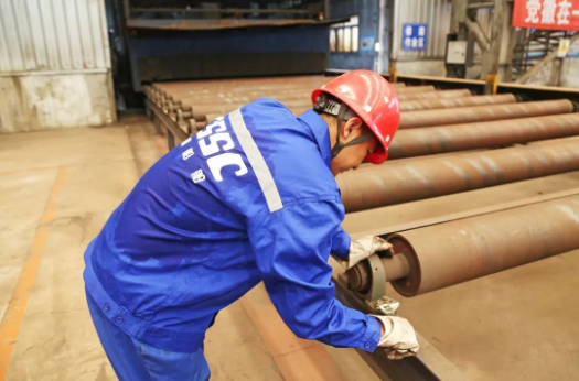 維修工閆師傅正在酷暑中檢修預(yù)處理生產(chǎn)線輥道。