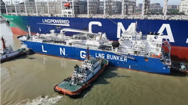 6月20日,全球首款江海直達(dá)型LNG加注船“淮河能源啟航”號(hào)在上海長(zhǎng)興島順利完成對(duì)全球首艘23000TEU雙燃料超大型集裝箱船“達(dá)飛 雅克·薩德”號(hào)的LNG燃料補(bǔ)給作業(yè)。這兩艘不同領(lǐng)域的“冠軍”船舶均由中船集團(tuán)旗下滬東中華建造,兩船首次“牽手”,為航運(yùn)業(yè)綠色低碳發(fā)展留下佳話。