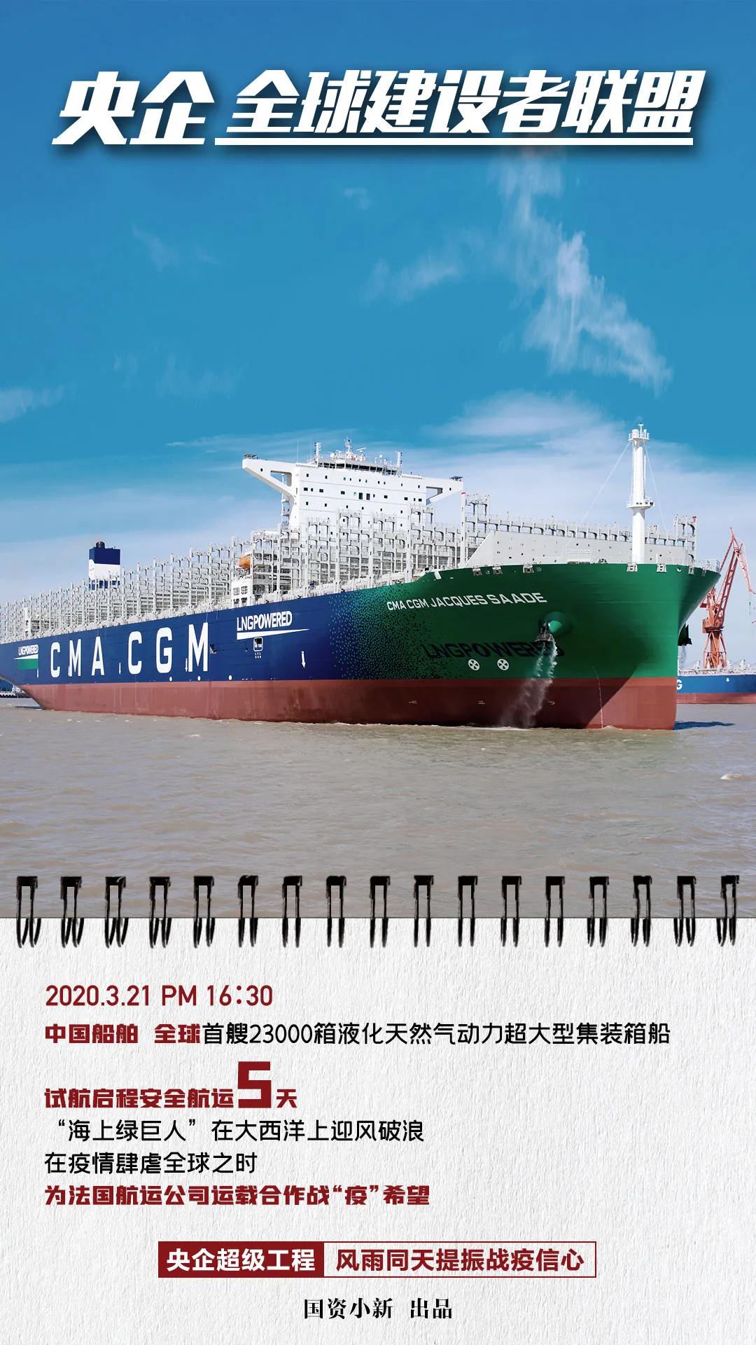 ????今天,國(guó)資小新發(fā)布圖文消息《央企全球建設(shè)者聯(lián)盟:風(fēng)雨同天提振國(guó)際合作戰(zhàn)疫信心!》。開(kāi)篇提到中國(guó)船舶集團(tuán)所屬滬東中華建造的全球首艘23000箱液化天然氣(LNG)動(dòng)力集裝箱船開(kāi)啟常規(guī)試航之旅,在疫情肆虐全球之時(shí),為法國(guó)航運(yùn)公司運(yùn)載合作戰(zhàn)“疫”希望。