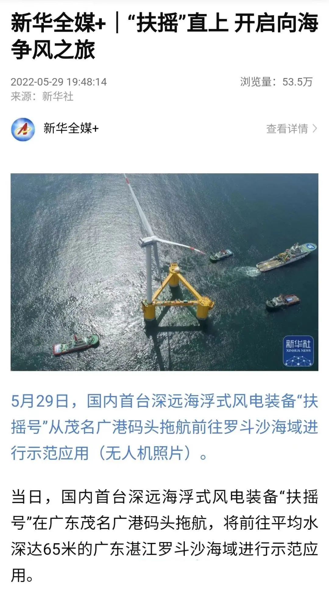 5月29日,中國船舶集團旗下中國海裝牽頭研制的國內(nèi)首臺深遠海浮式風電裝備——“扶搖號”從廣東茂名碼頭起航,前往平均水深65米的廣東湛江附近海域投入示范應(yīng)用。