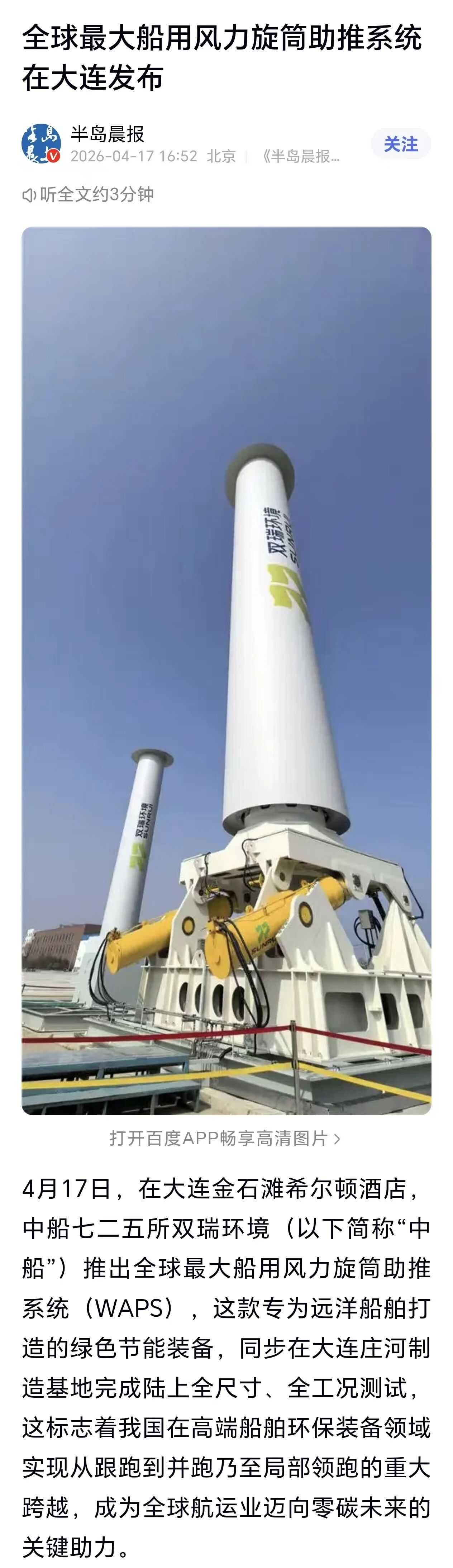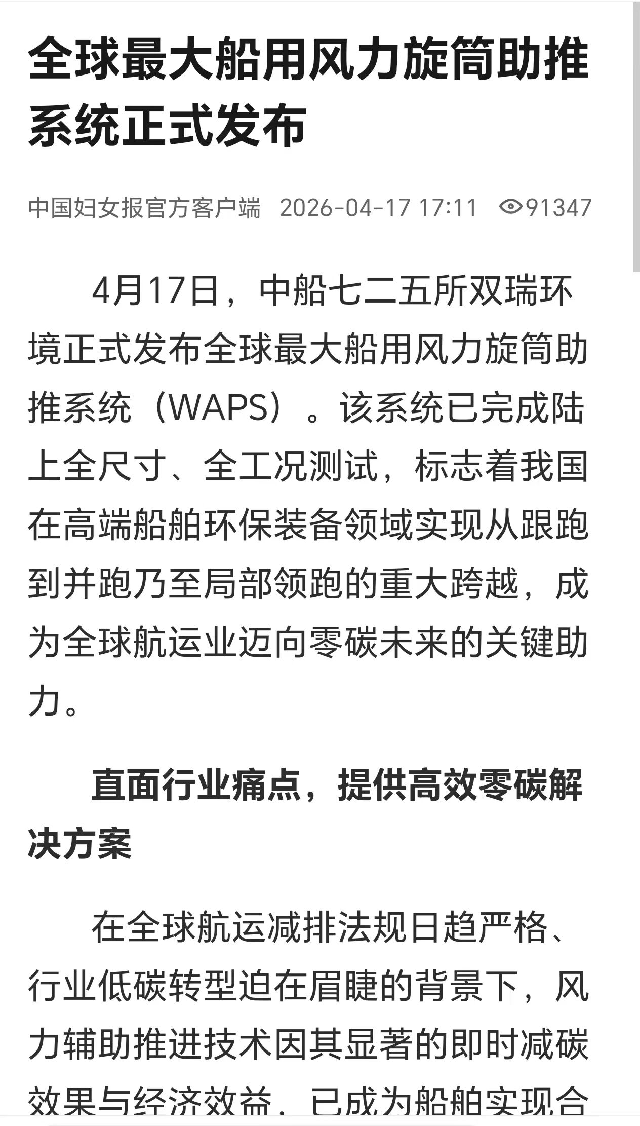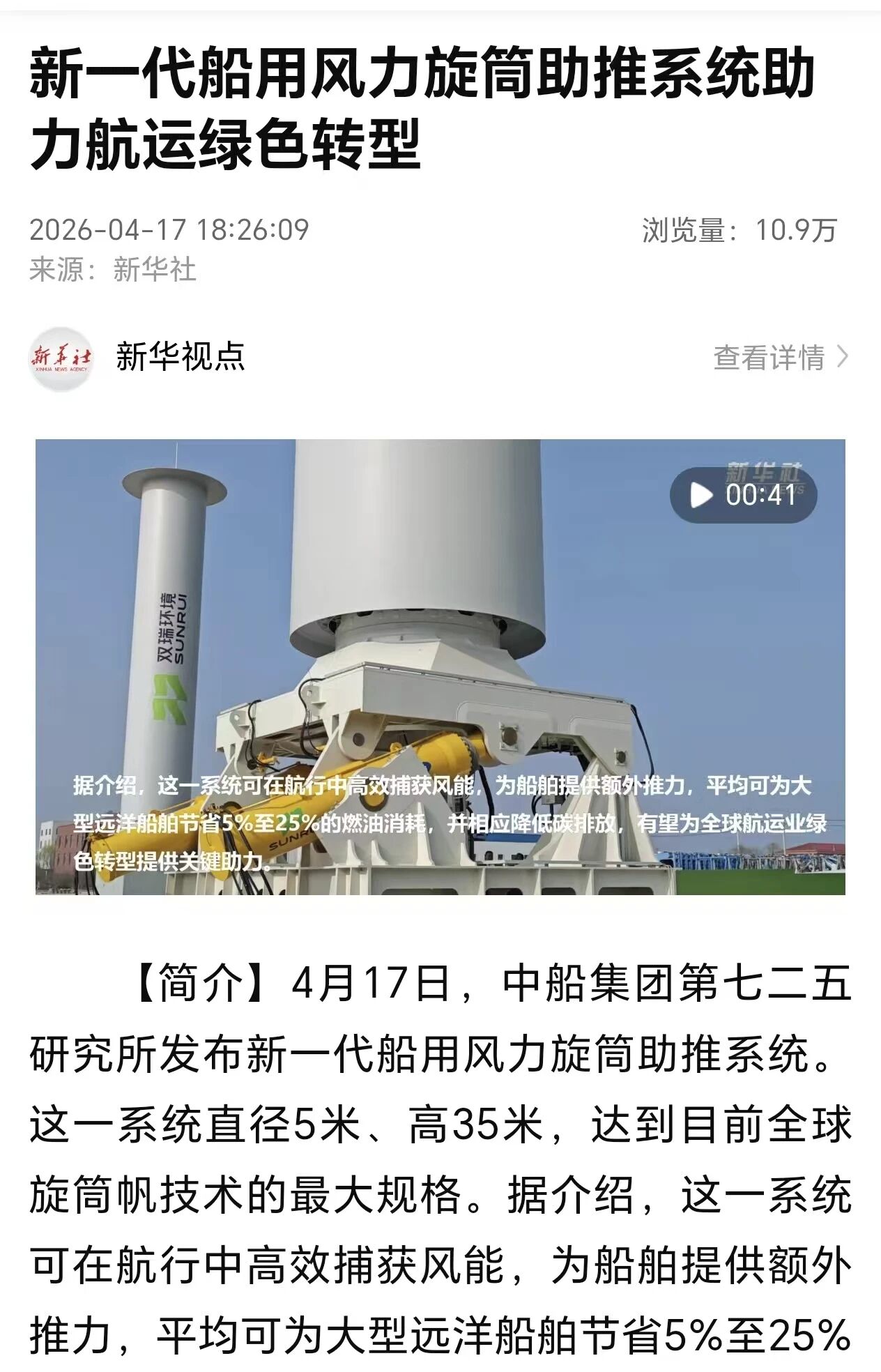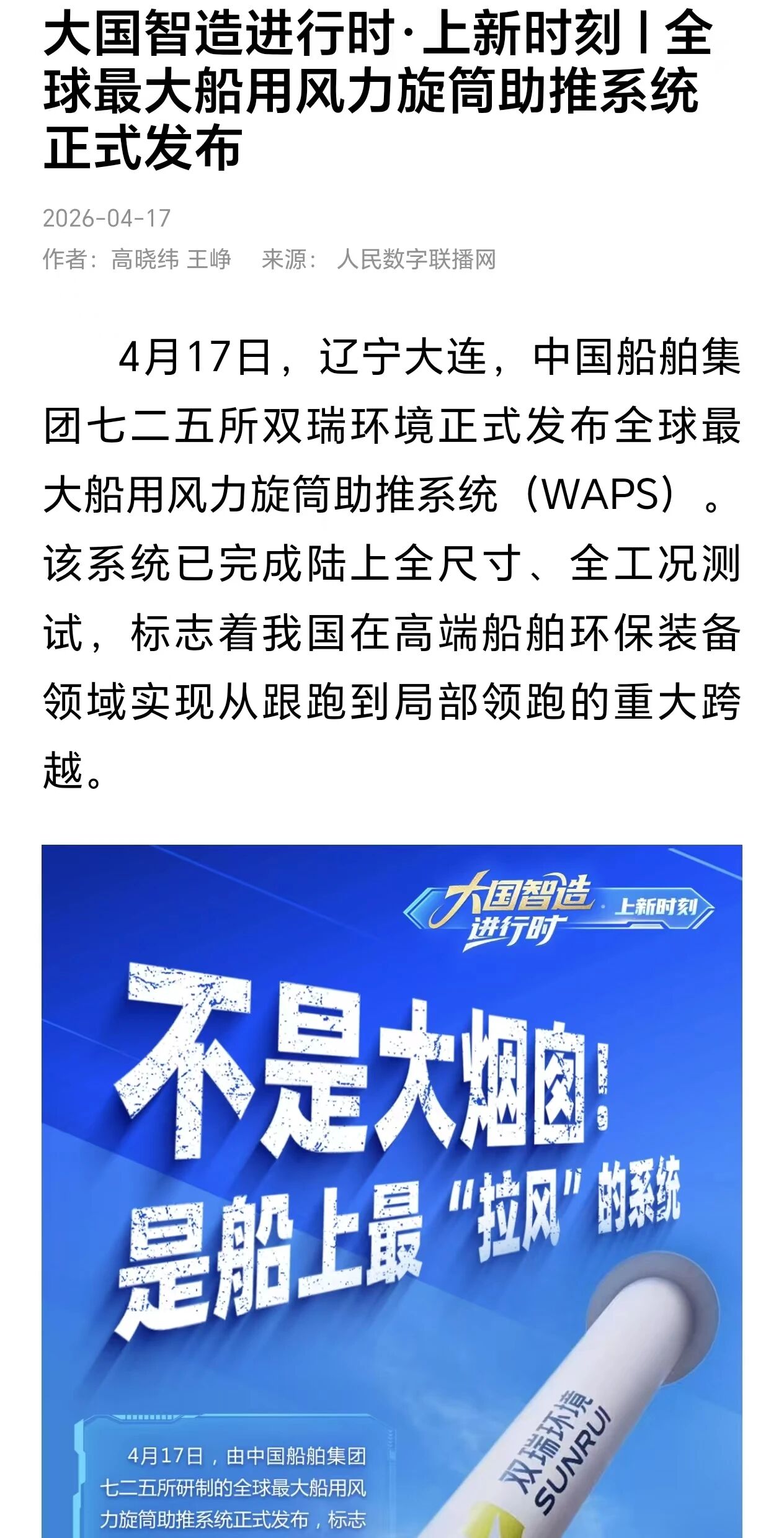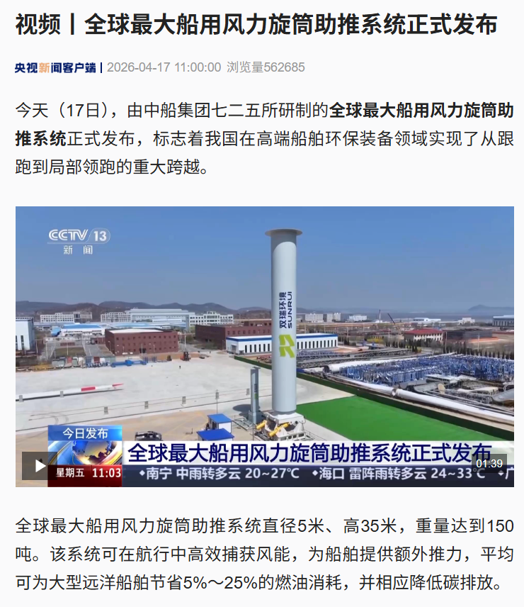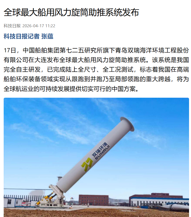 4月17日,中國(guó)船舶集團(tuán)有限公司七二五所旗下雙瑞環(huán)境正式發(fā)布全球最大船用風(fēng)力旋筒助推系統(tǒng)。
