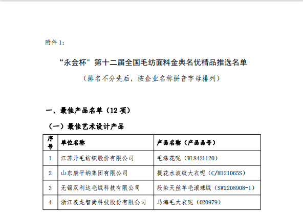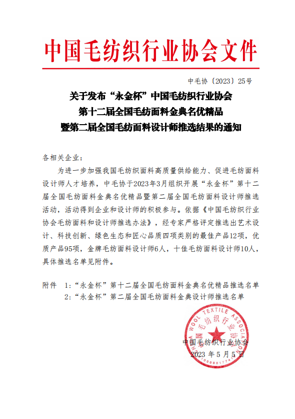 近日,在中國毛紡織行業(yè)協(xié)會(huì)組織開展的“永金杯”第十二屆全國毛紡面料金典名優(yōu)精品暨第二屆全國毛紡面料設(shè)計(jì)師推選活動(dòng)中,山東康平納集團(tuán)有限公司推選的毛紡面料-榮獲“永金杯”--最佳藝術(shù)設(shè)計(jì)產(chǎn)品獎(jiǎng)及匠心品質(zhì)產(chǎn)品獎(jiǎng)”。